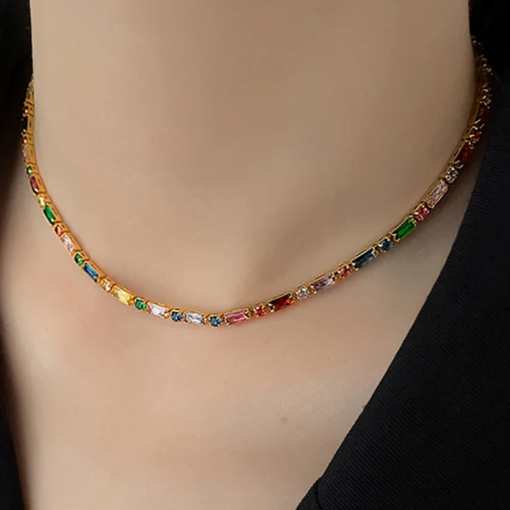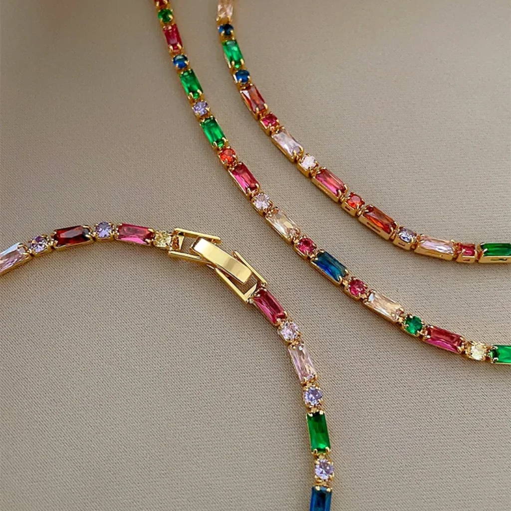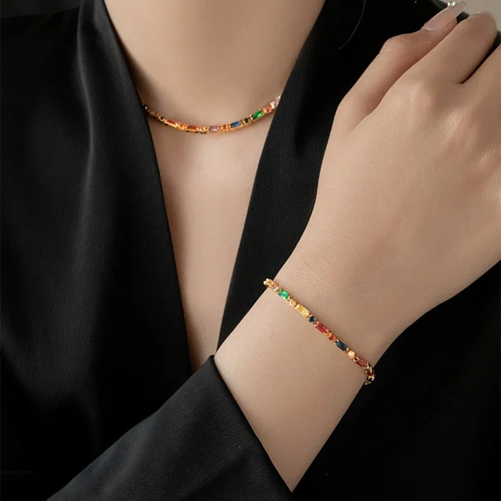 Composto por colar gargantilha e pulseira, o conjunto é adornado com zircões coloridos em zircônia cúbica, que refletem a luz com intensidade e elegância. Um acessório perfeito para elevar qualquer produção — do look minimalista ao visual mais sofisticado para festas e eventos especiais.